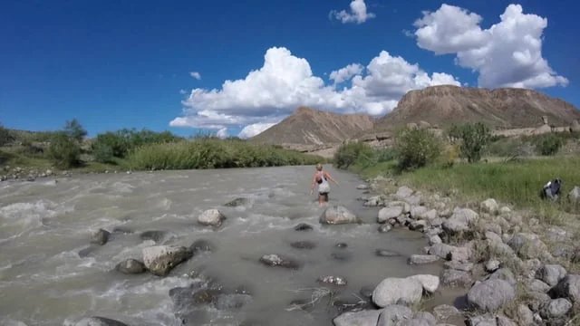 Performative walk up the Rio Grande in Big Bend, TX with handmade dress of cheesecloth, tarp, thread, and stencil, 2016.
