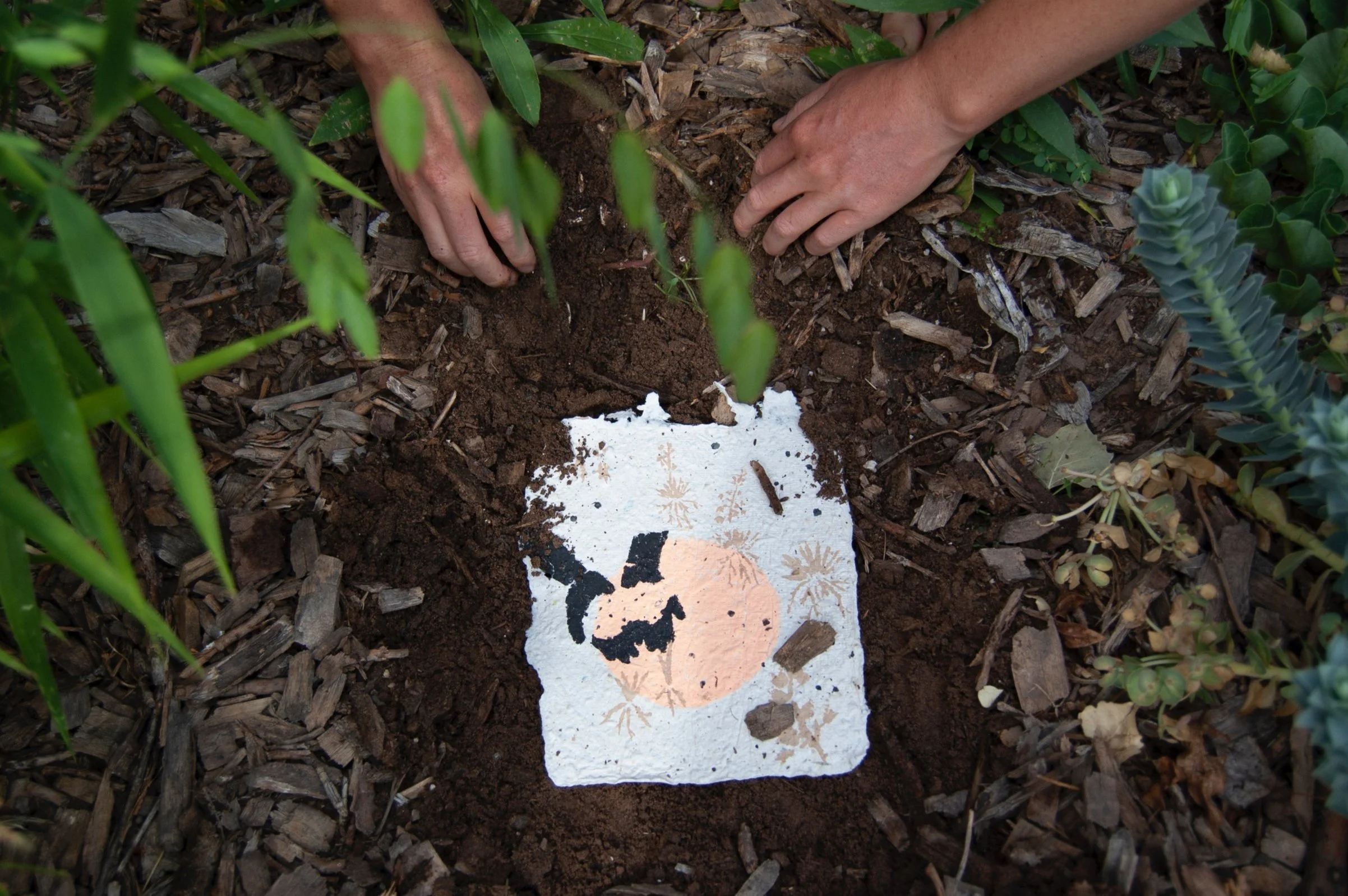 Through seed dispersal plants, otherwise rooted, migrate. Tuck this seed paper into the dirt where the sun shines. Water regularly until roots settle into the soil. Watch for wildflowers.